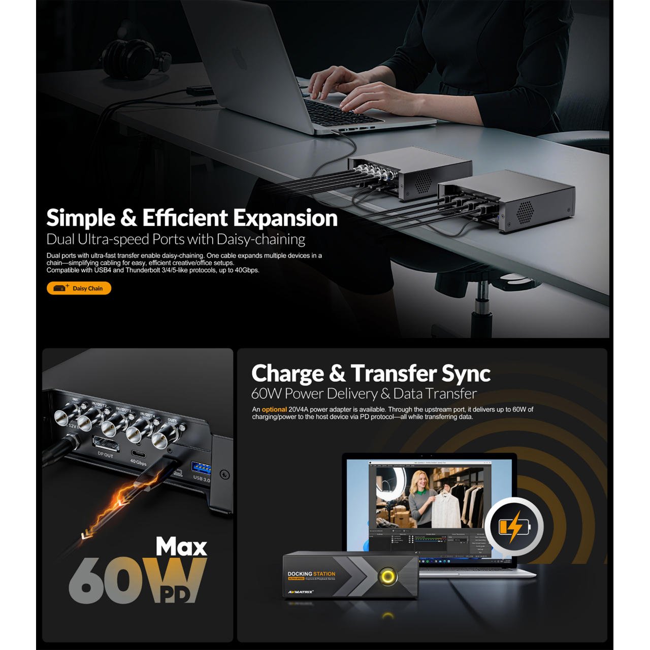 The AVMATRIX Docking Station system is a smart modular box setup which allows you to daisy-chain any of its selection of individual modules together using Thunderbolt cables to create an adaptable conversion and capture workflow. AVMATRIX TB-P30 is a Thunderbolt Box Series 3-Channel 3G-SDI HDMI Docking Station with Ultra-Speed Playback.
