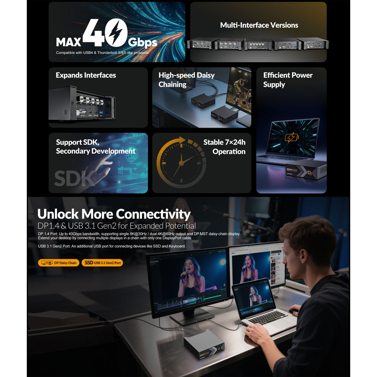 The AVMATRIX Docking Station system is a smart modular box setup which allows you to daisy-chain any of its selection of individual modules together using Thunderbolt cables to create an adaptable conversion and capture workflow. AVMATRIX TB-P51 is a Thunderbolt Box Series 5-Channel 3G-SDI Docking Station with Ultra-Speed Capture & Playback.