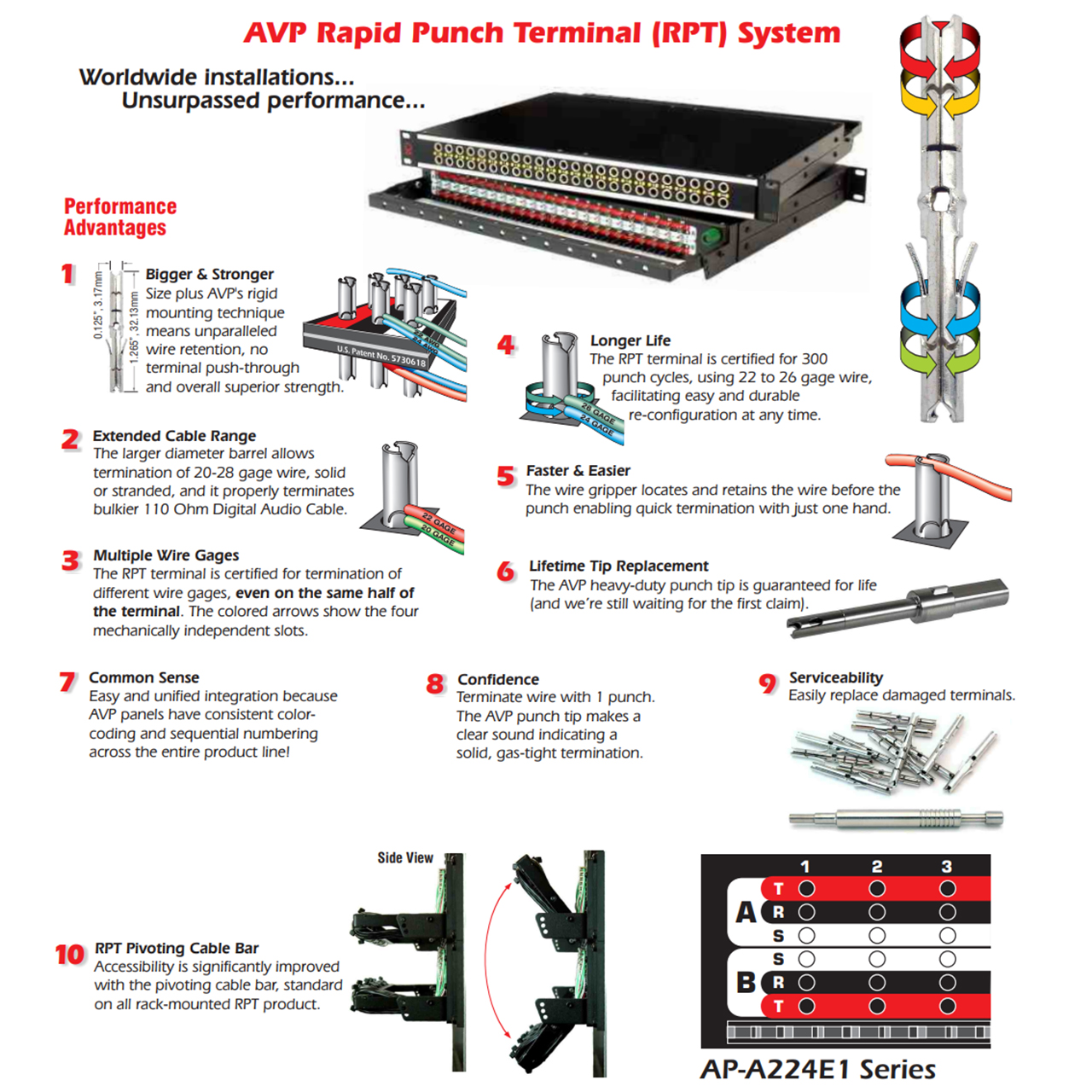 The AVP AP-A224E1-L-FN-RPT is a 1RU 48 Jack Longrame Rapid Punch Terminal (RPT) Patchbay with Full Normals. The RPT terminal is certified for termination of different wire gages, even on the same half of the terminal.