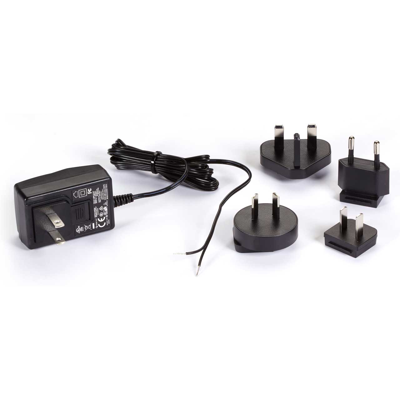 • Connectors: Input: wallmount interchangeable plugs: US, EU, UK, AU, CN Output: two wires (wire with lettering is negative, black wire with white stripe is positive)