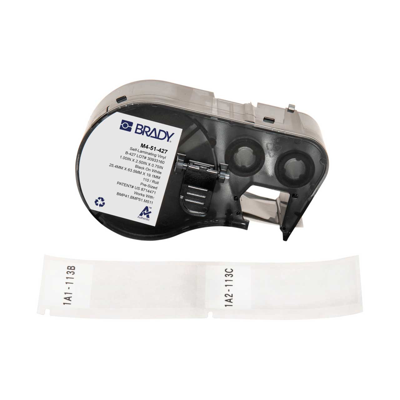 Mark cables and wires with the B-427 self-laminating vinyl label material, designed with a clear self-laminating protective layer. Print almost anywhere with a durable Brady portable label printer.Brady ribbons feature a flexible design for tightly-curved surfaces such as wires and cables. The Brady team has gone to great lengths to insure durability. They also built a product that is elf-extinguishing, resistant to abrasion, solvents, oil, grease, weather and extreme temperatures. Thet have also put an emphasis on reliablility Brady's labels are made with a permanent acrylic adhesive that works great on smooth or rough, powder-coated and irregular surfaces.The typeface is secured with a clear, non-printable overlaminate for increased protection. Use this material to identify wires, cables when protecting the printed text with an integrated overlaminate is needed.The labels are UL recognized to UL 2238, RoHS compliant to 2011/65/EU (Pass 2015/863).