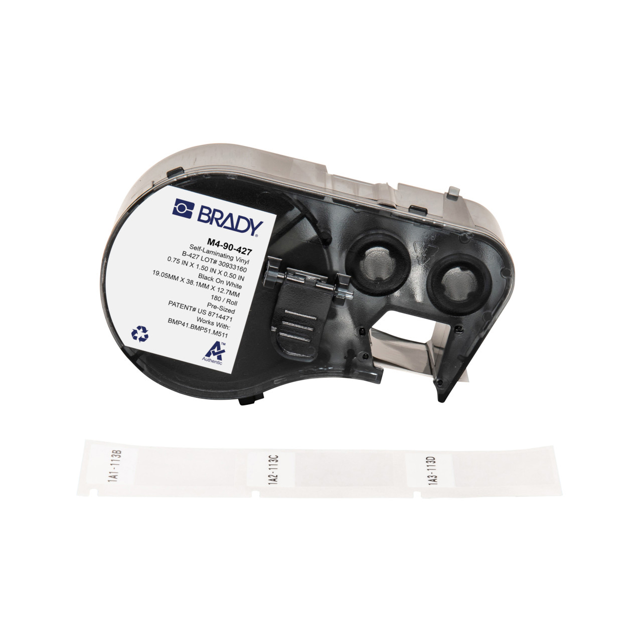 Mark cables and wires with the B-427 self-laminating vinyl label material, designed with a clear self-laminating protective layer. Print almost anywhere with a durable Brady portable label printer.