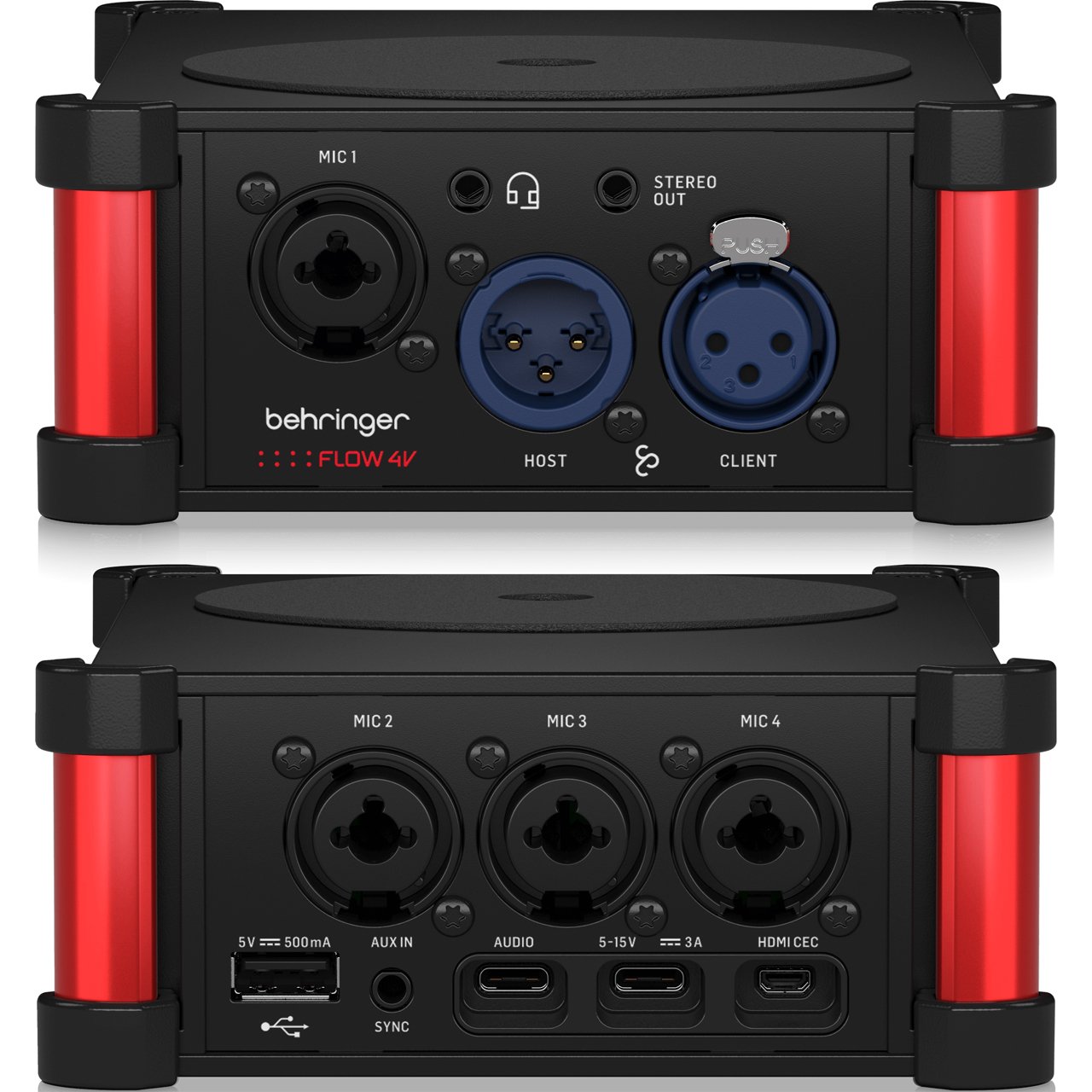 Behringer FLOW 4V is a 10-track field recorder equipped with four onboard dual-stage preamps with extreme dynamic range. It also functions as a standalone 32-bit float USB audio interface and an I/O box for other StageConnect devices. Record and mix line level signals using the stereo AUX input. FLOW 4V can be expanded with four additional remote inputs via StageConnect using FLOW 4VIO.