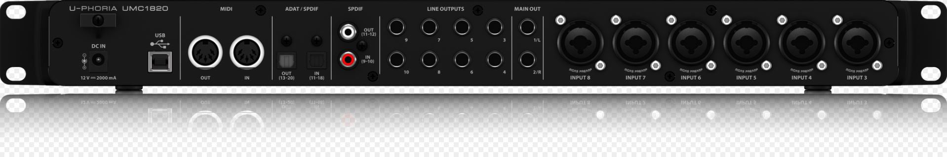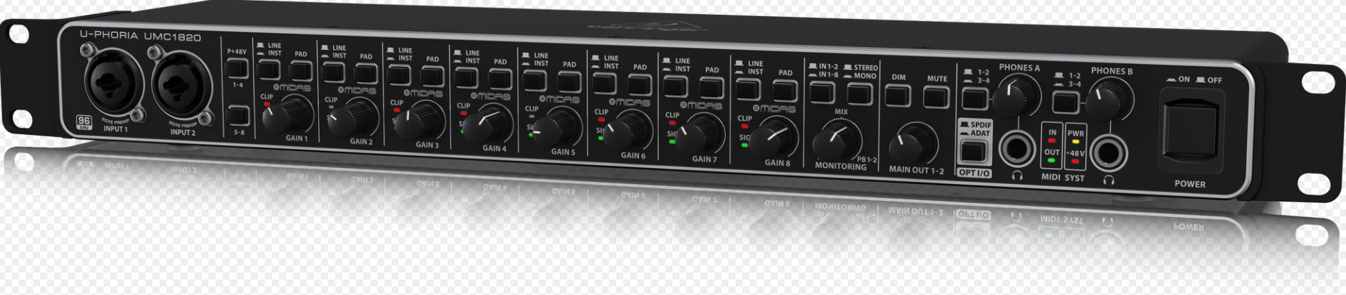 The incredible Behringer U-PHORIA UMC1820 bridges the gap between your creativity and your fans. This blazingly fast USB 2.0 studio-in-a-box will have you recording your next masterpiece in minutes with all the connectivity required for your microphones, guitars, keyboards and even MIDI devices. Record the perfect vocal right to your computer-based DAW thanks to the eight astonishingly clear, world-class MIDAS-designed mic preamps, which include +48V phantom power for condenser microphones, all going through studio-grade 24-Bit/96kHz converters for the best possible sound quality. It also provides I/O support for S/PDIF, ADAT and S/MUX formats. Whether you're a singer-songwriter, producer on the go, or just need a rock-solid interface for running backing tracks at a gig, the ultra-dependable U-PHORIA UMC1820 will help you shine in the digital domain.