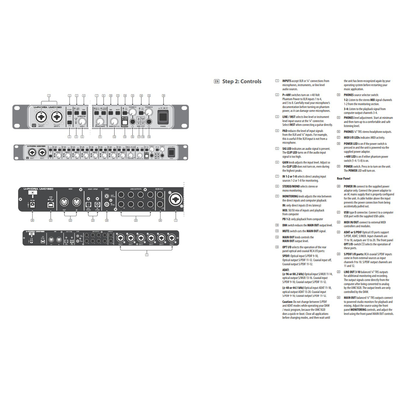 The UMC1820 mix control allows zero-latency direct monitoring, which means musicians can experience their performance clearly and with no delay or lag in the returning signal, resulting in a better performance and recording. Its powerful phones output has its own level control and Monitor A/B source select for DJ-style cueing. Plus they provide free audio recording, editing and podcasting software, plus 150 instrument/effect plug-ins-just a download away at behringer.com.