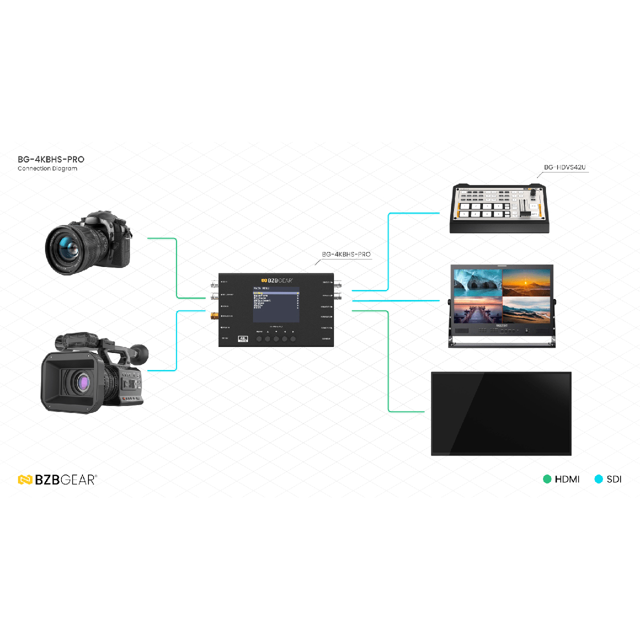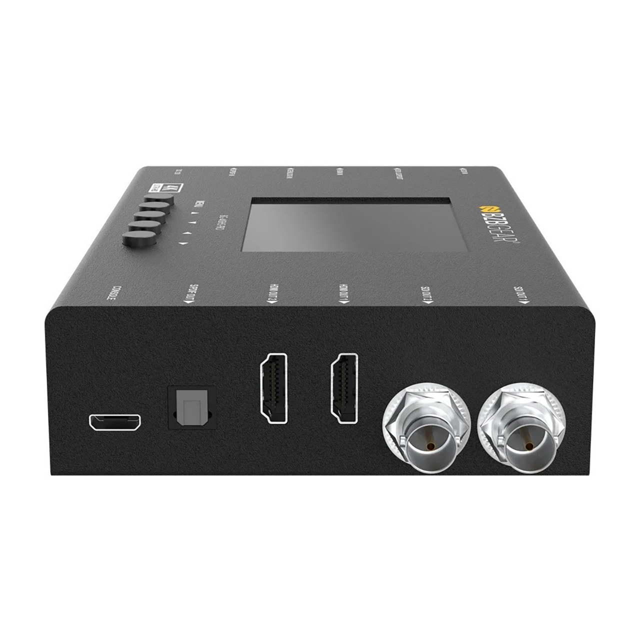The BZBGEAR BG-4KBHS-PRO is a versatile HDMI 2.0 and 12G/6G/3G/HD-SDI cross-converter and scaler designed for professional monitoring, signal conversion, and testing applications. Equipped with a 3.5" LCD display and intuitive push-button controls, it provides real-time monitoring and on-screen display (OSD) management for resolution, image adjustments, and output configuration. With support for a wide range of formats - including 12G-SDI 4K60 and HDMI 2.0 up to 4K60 - it ensures compatibility across broadcast, production, and AV environments.