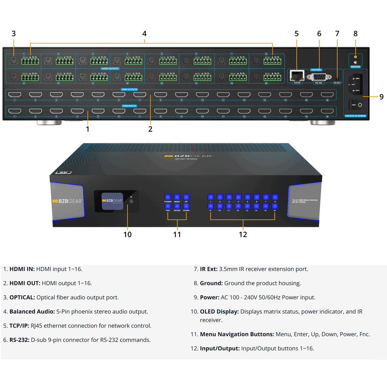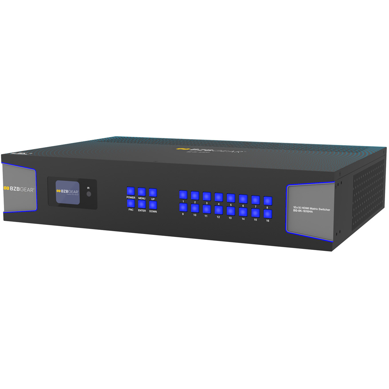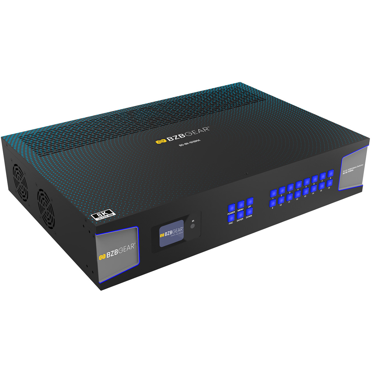 The BZBGEAR BG-8K-1616MA 8K HDMI matrix switch is an excellent device for situations where you need to share up to sixteen HDMI sources with up to sixteen displays. It comes with sixteen HDMI 2.1a inputs and sixteen HDMI 2.1a outputs, allowing you to switch between multiple sources and display them on various screens at the same time, or select one source and display it on all screens simultaneously with the push of a button. The device supports 8K resolutions and various high-quality audio formats, ensuring professional-grade picture and audio quality.