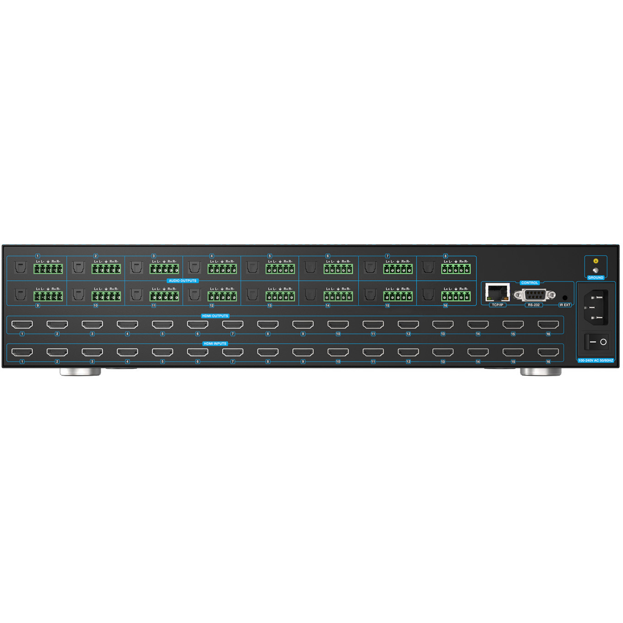 The BG-8K-1616MA offers multiple control methods including front panel controls, IR remote control, RS-232, or TCP/IP(Web GUI). The included IR receiver allows the unit to be controlled with the included remote while located out of sight for a clean installation.