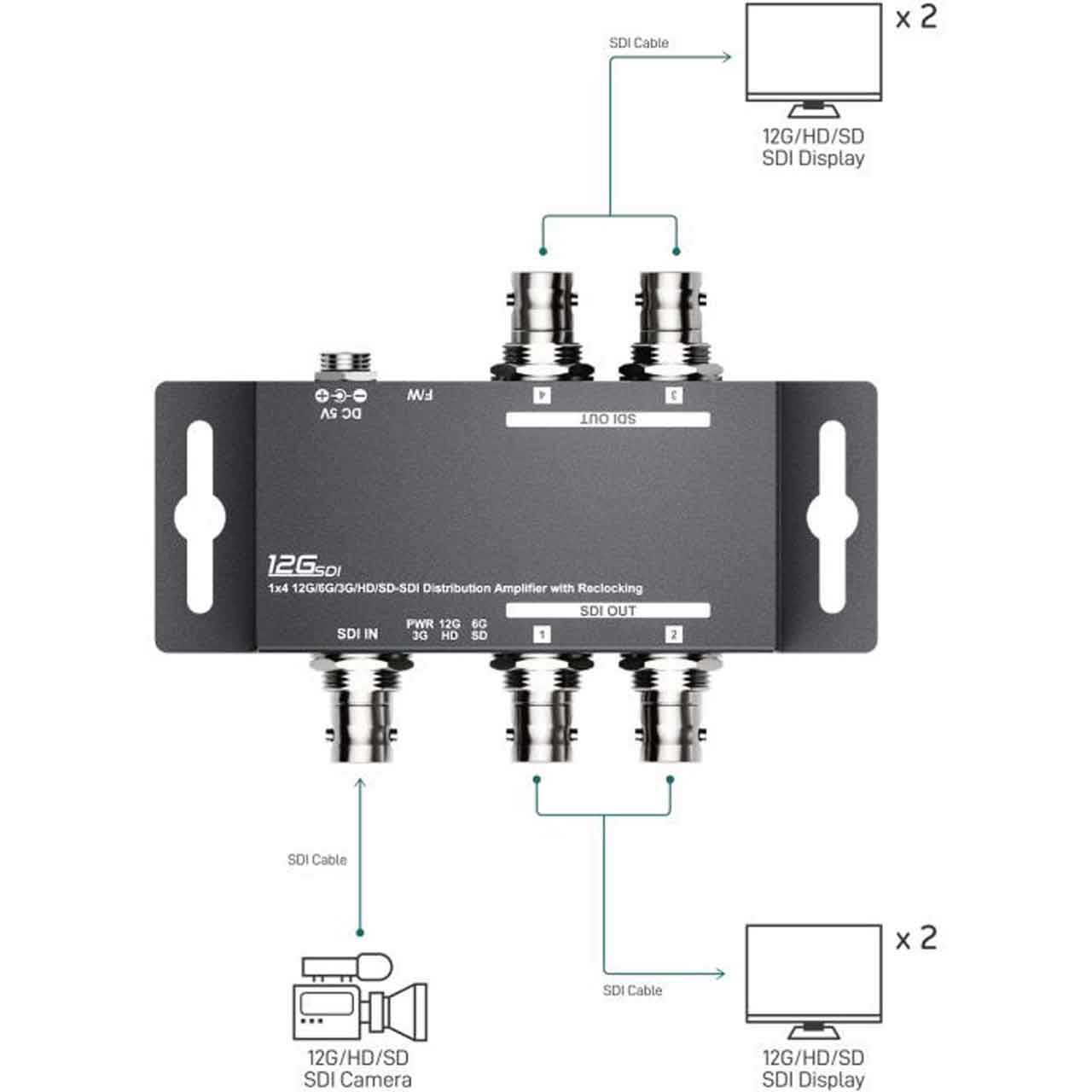 The BZBGEAR BG-DA-12GS1X4 is a 1x4 12G-SDI splitter and distribution amplifier. This device can split an SD, HD, 3G, 6G, or 12G-SDI video source to up to four SDI outputs simultaneously. If you need to connect additional display for video feed monitoring or distribute 4K signal to a long distance, daisy chain and cascade multiple units to build large video distribution solution - this product is what you need.
