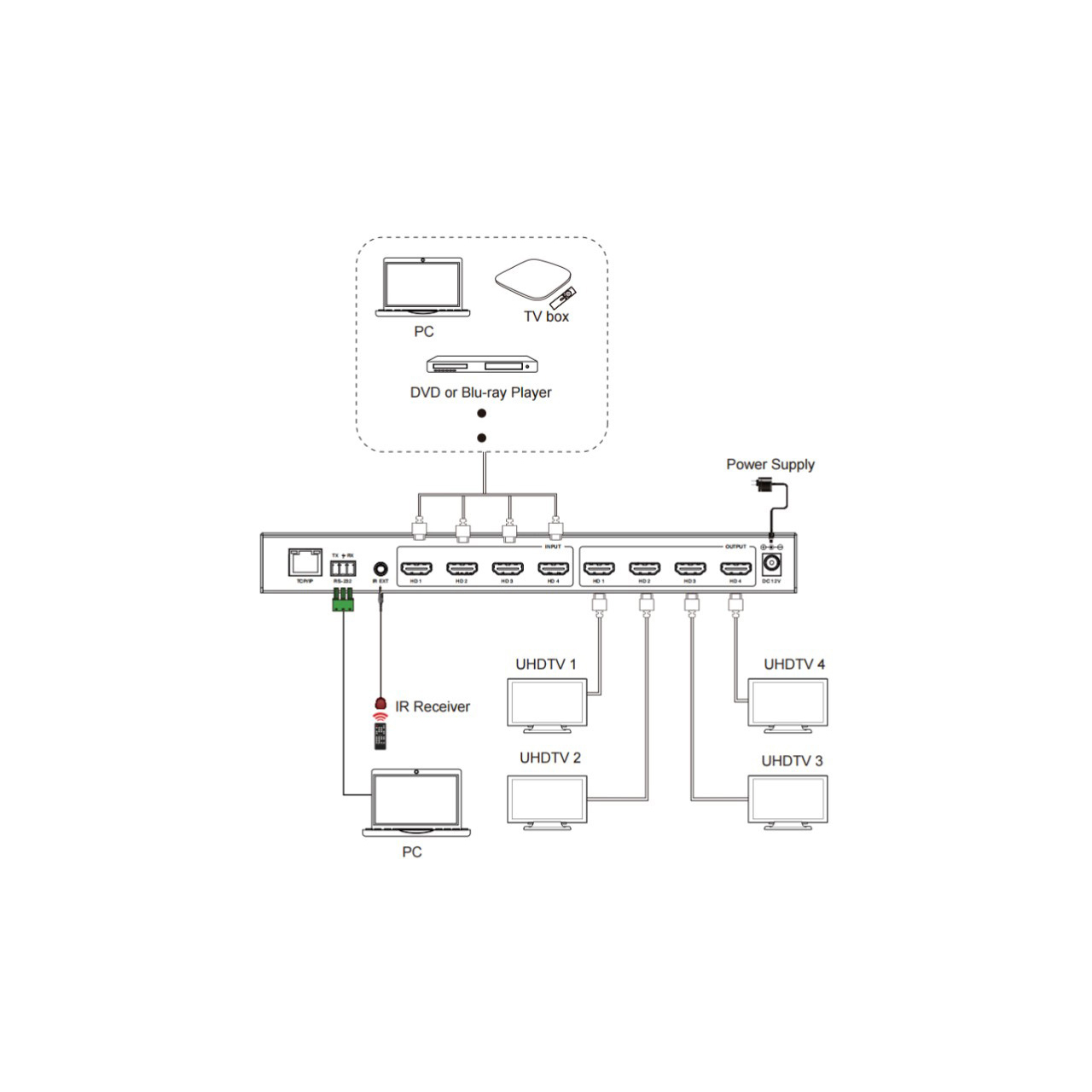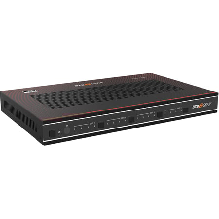 The BZBGEAR BG-MVS4X4-4KL 4K60 4:4:4 HDMI matrix is a versatile high-speed matrix switcher and video wall processor with multiple applications. This system can be configured for two different output modes, serving as a 4x4 seamless matrix switcher or as a 2x2, 4x1, or 1x4 video wall solution, among other possibilities. Additionally, it is equipped with a web browser interface module for convenient control and configuration when used either as a standalone device or in conjunction with a third-party control system. Control options include front-panel push buttons, an IR remote control, RS-232 interface, and TCP/IP connectivity.