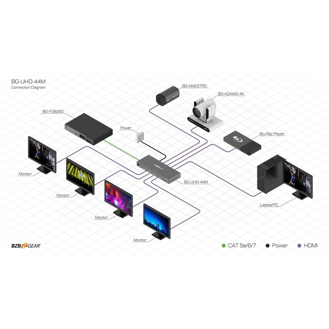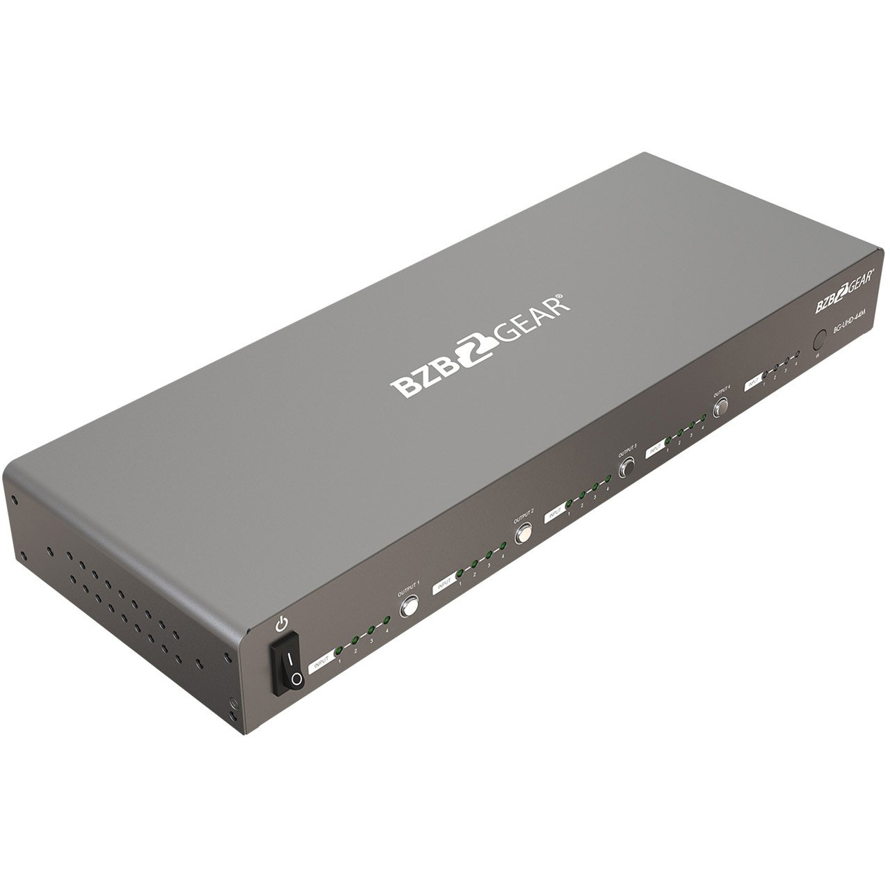 With four HDMI 2.0a inputs and four HDMI 2.0a outputs, the BZBGEAR BG-UHD-44M 4K HDMI matrix switch allows users to share up to four HDMI sources with up to four displays. Perfect for when you need to change multiple sources to show on multiple displays or even select just one source to show on all displays with the press of a button. Professional-grade picture and audio quality are achieved with support for 4K resolutions and a variety of high quality audio formats. This product meets the standards of the Trade Agreement Act (TAA).
