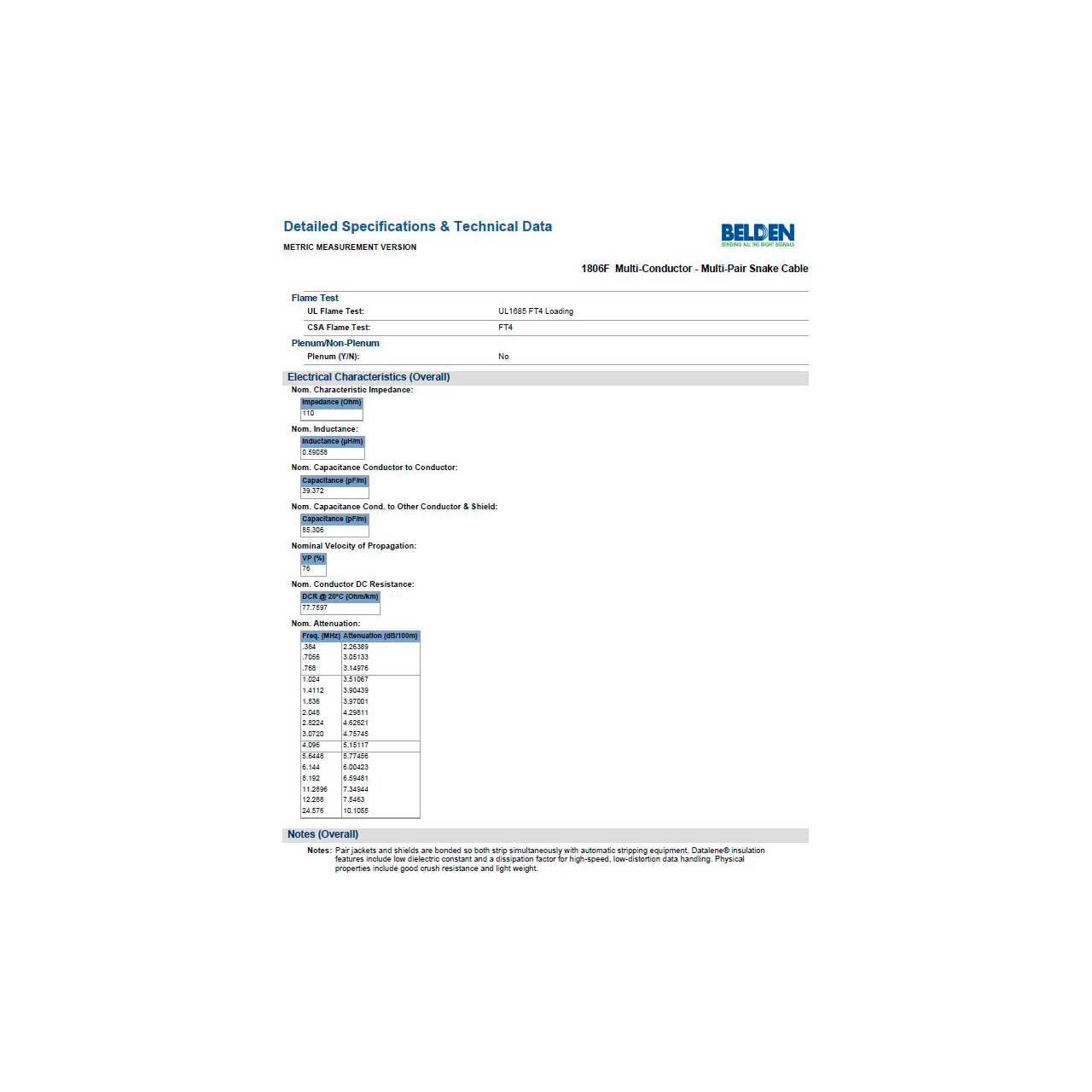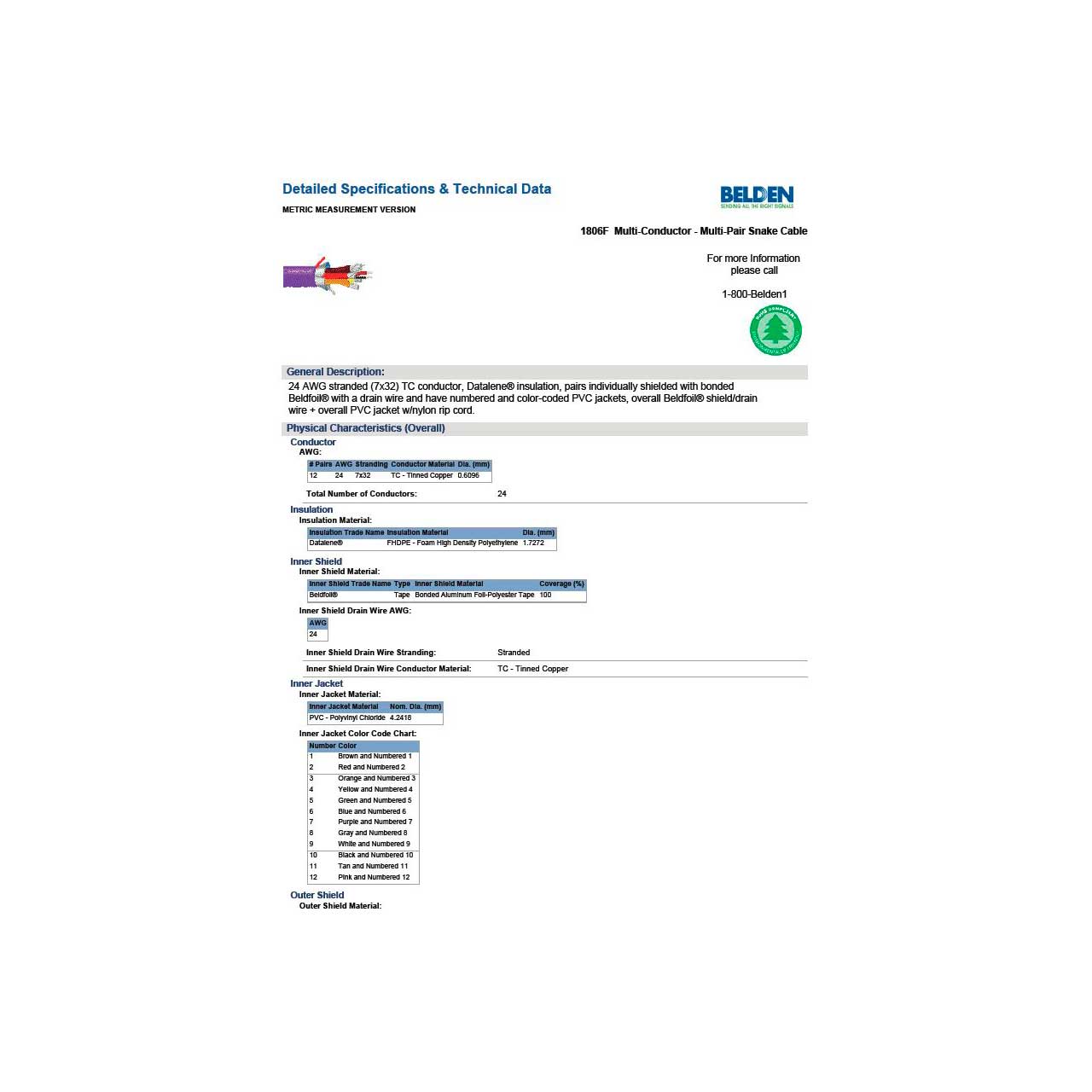 Belden 1806F Digital Audio Snake Cable, CMG-Rated, 12-24 AWG tinned copper pairs, Datalene insulation, individually shielded with Beldfoil, numbered/color-coded PVC jackets, flexible PVC jacket.