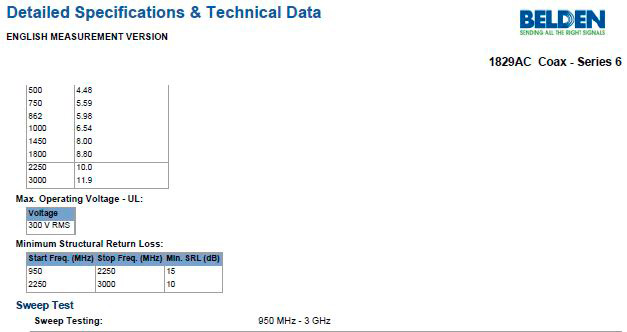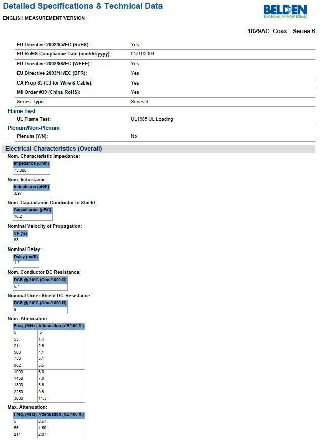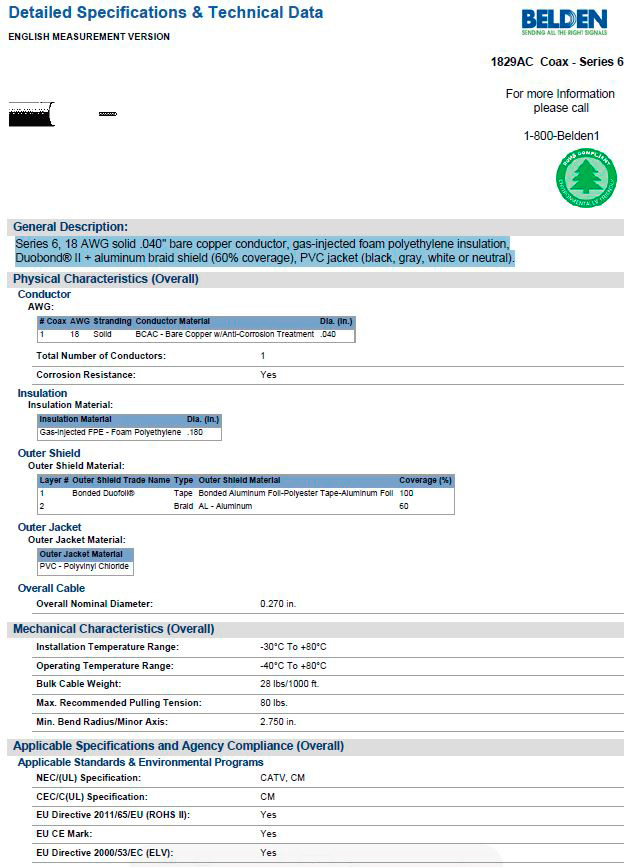 The Belden 1829AC is a Series 6, 18 AWG BCAC (Bare Copper w/Anti-Corrosion Treatment) solid RG6 coax cable. It's made up of a .040" bare copper conductor, gas-injected foam polyethylene insulation, Duobond II tape shield for 100% coverage and aluminum braid shield for 60% coverage, and a PVC jacket. This cable is ideal for indoor use in CATV and Direct Broadcast Satellite (DBS) installs.