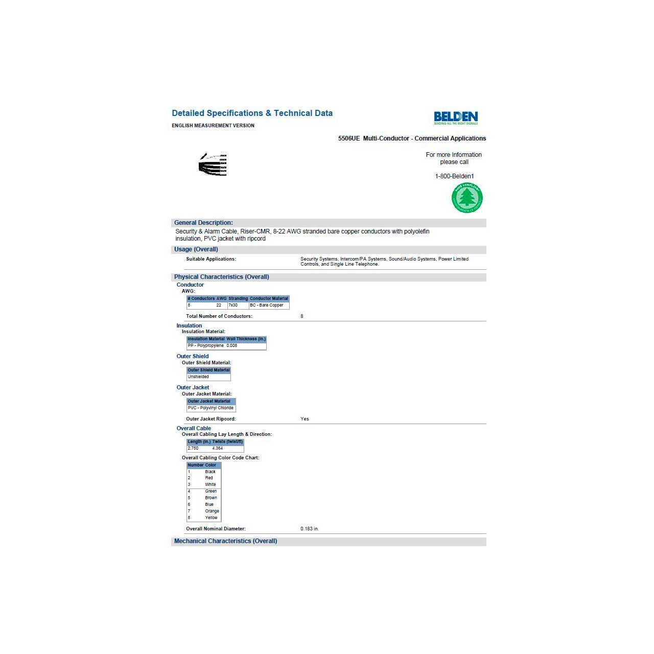 Belden 5506UE Security & Alarm Cable, Riser-CMR, 8-22 AWG stranded bare copper conductors with polyolefin insulation, PVC jacket with ripcord. Suitable for Security Systems, Intercom/PA Systems, Sound/Audio Systems, Power Limited Controls, and Single Line Telephone applications.
