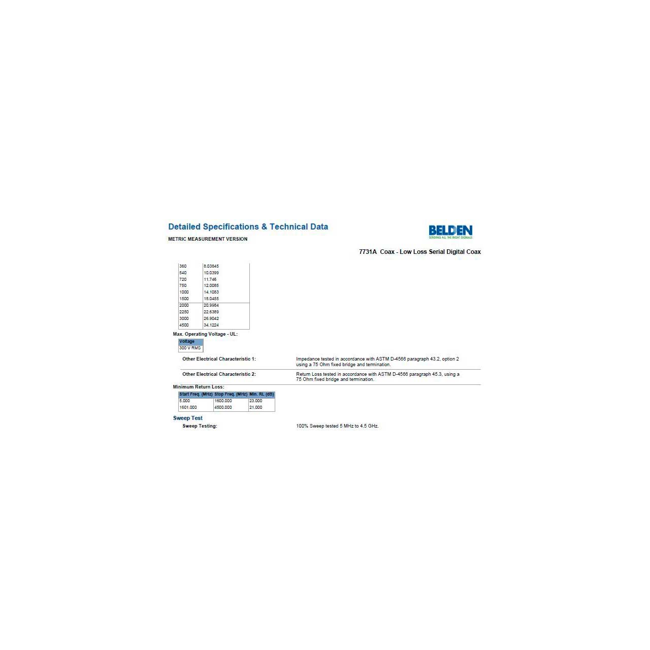 Belden 7731A is a 75 Ohm 6G-SDI RG-11 Coax. It's 14 AWG with a Solid Bare Copper Conductor, PE Insulation, Foil + 95% Tinned Copper Braid Shield in a CMR rated PVC Jacket.