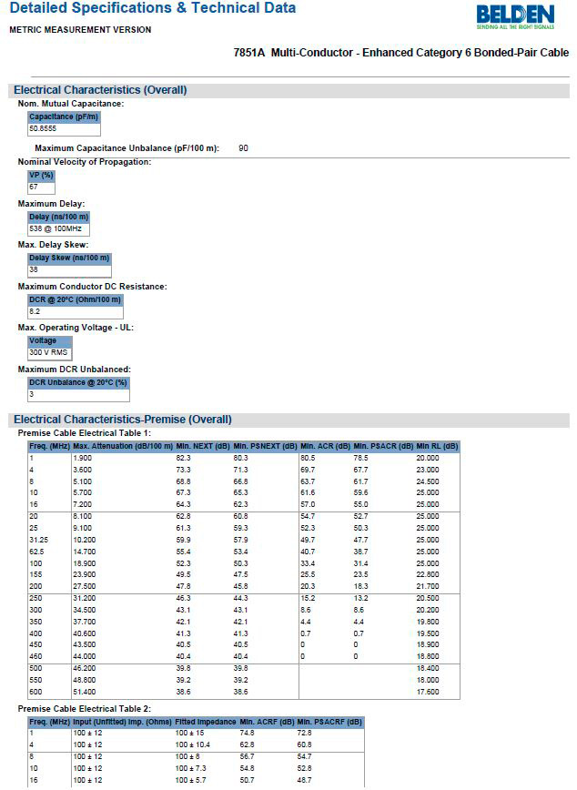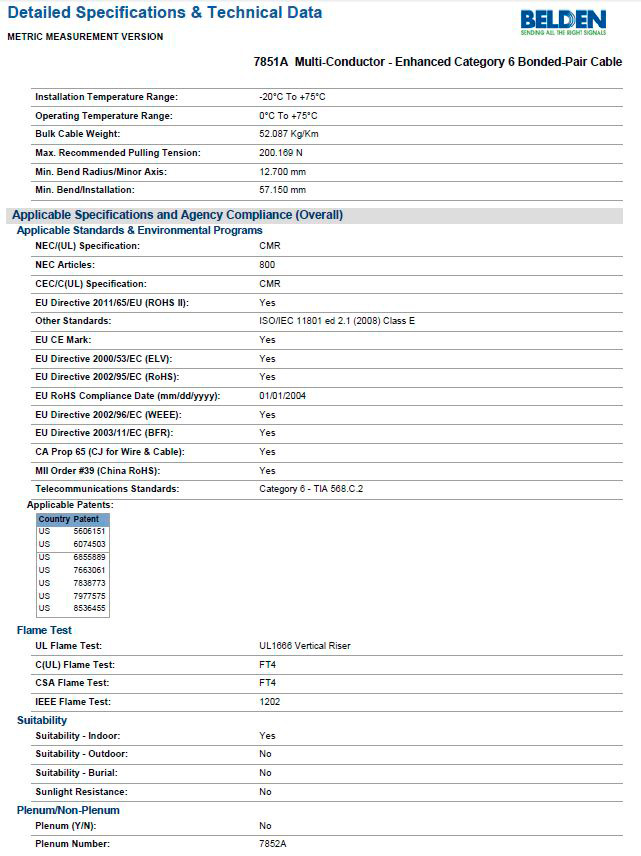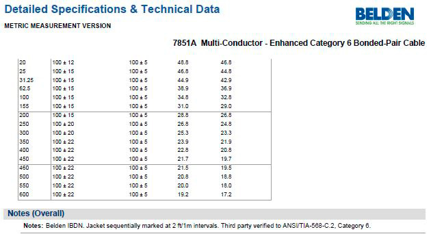 Belden's 7851A has 23 AWG bonded-pairs solid bare copper conductors, non-plenum, polyolefin insulation, patented e-spline center member, rip cord, and an Orange PVC jacket.
