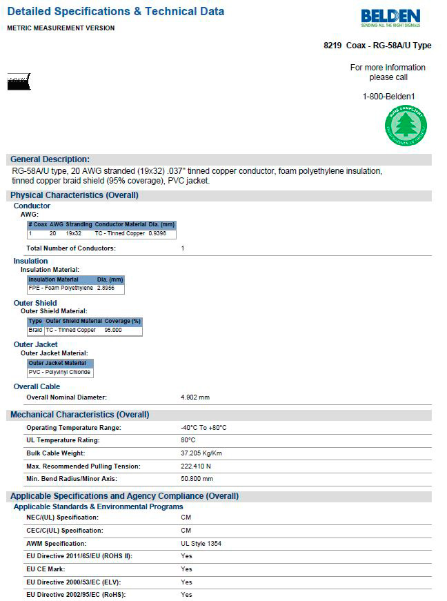 RG-58A/U type, 20 AWG stranded (19x32) .037" tinned copper conductor, foam polyethylene insulation, tinned copper braid shield (95% coverage), PVC jacket.