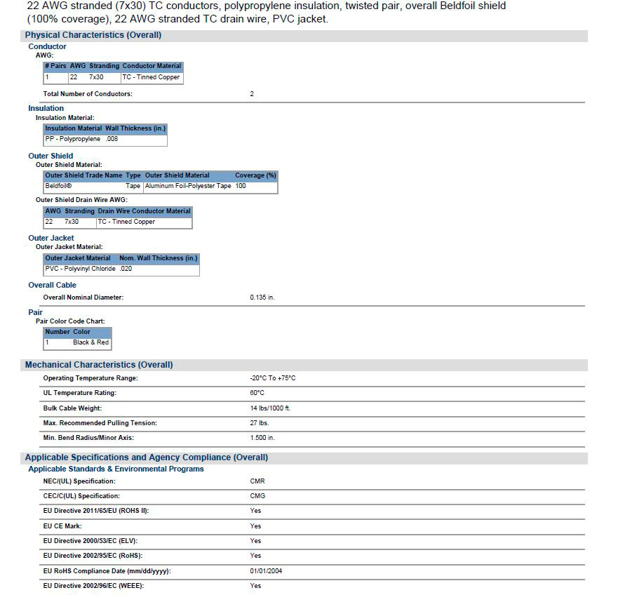 Belden 9451 Audio Cable, 1 Pair 22 AWG stranded (7x30) tinned copper pair, polypropylene insulation, Beldfoil shield, drain, Riser, PVC jacket. Suitable for Automatic Stripping Equipment; Low Voltage analog Signals (4-20mA, 0-10V, ); Low Voltage Digital Control (24V, ); Line Level audio; Computer Communication and Panel Wiring applications.