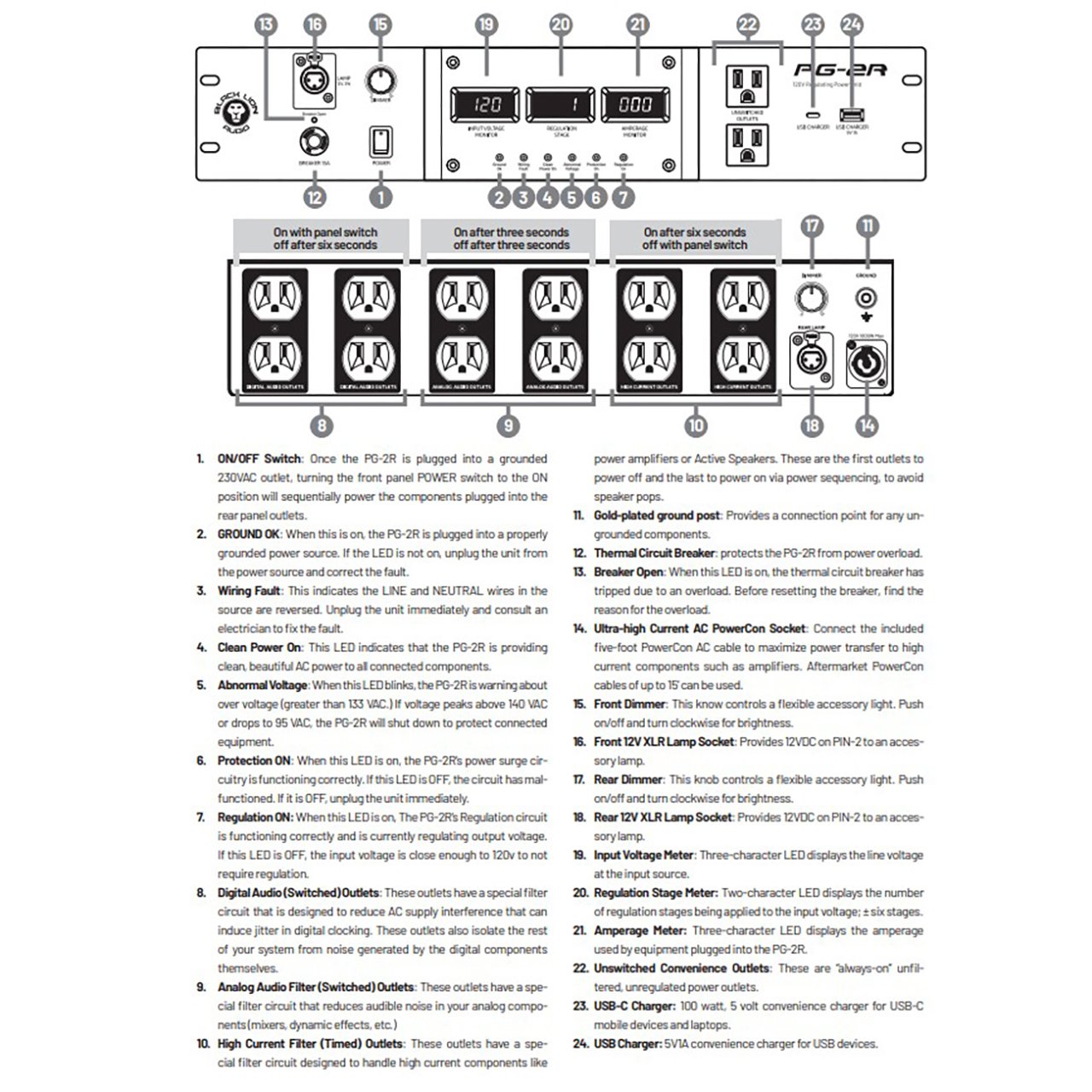 The PG-2R features a bank of 12 switched, filtered and surge protected outlets on the back panel - combined into four groups (two Digital Audio, Analog Audio, and High Current). The Analog Audio and High Current outlets are time delayed, always ensuring that your speakers and power amplifiers are the last to turn on, and the first to turn off - this prevents the dreaded "pop" that can occur if speakers receive power at the same time as your sound sources. The PG-2R also features two filtered convenience outlets, and two USB chargers on the front panel, as well as XLR lamp connectors on both the front and back panels.