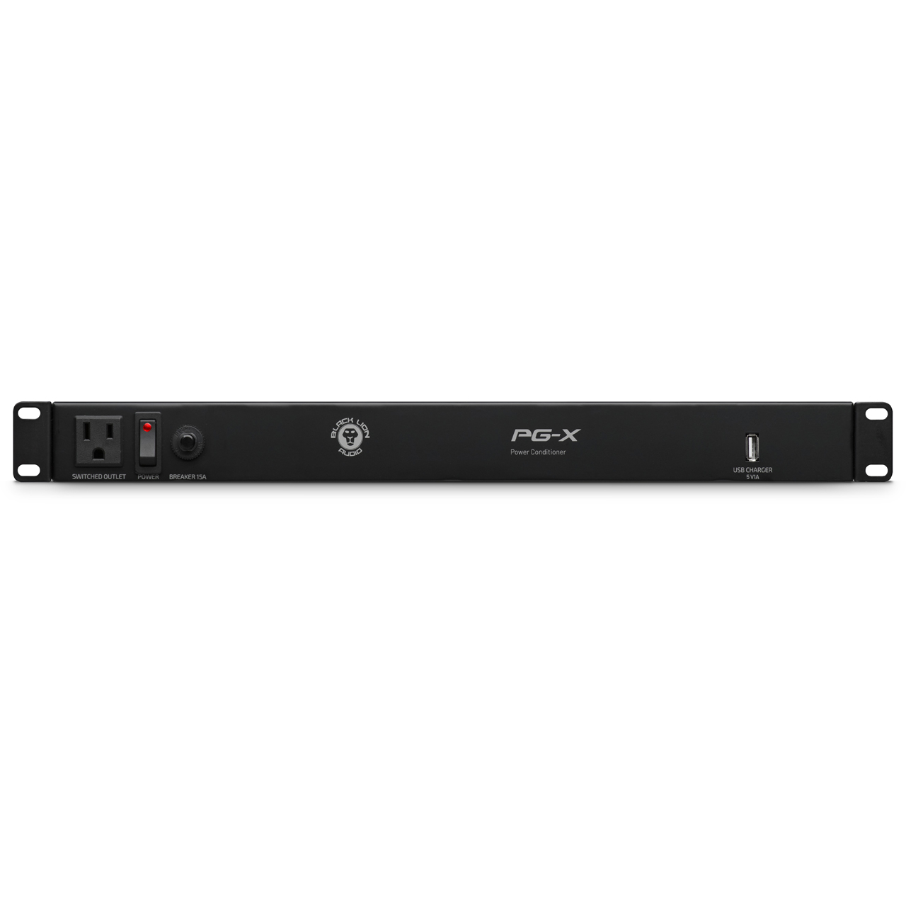 The Black Lion Audio Rackmount PG-X Power Conditioner with PG-90 Filtering Technology, Panasonic capacitors, eight rear switched, filtered and surge protected outlets, one front-panel switched convenience outlet and USB port for device charging.