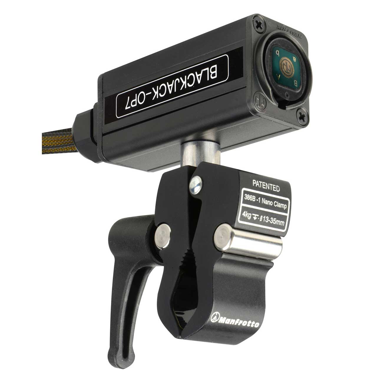 Camplex BlackJack-OP adapters were designed to be the perfect bridge to convert any device with standard fiber optic I/O connections to a rugged tactical Neutrik opticalCON cable run. This opticalCON QUAD to Four (4) ST Multimode Breakout Adapter features a heavy duty aluminum tripod clamp and a secure reliable grip for round or flat pole surfaces.