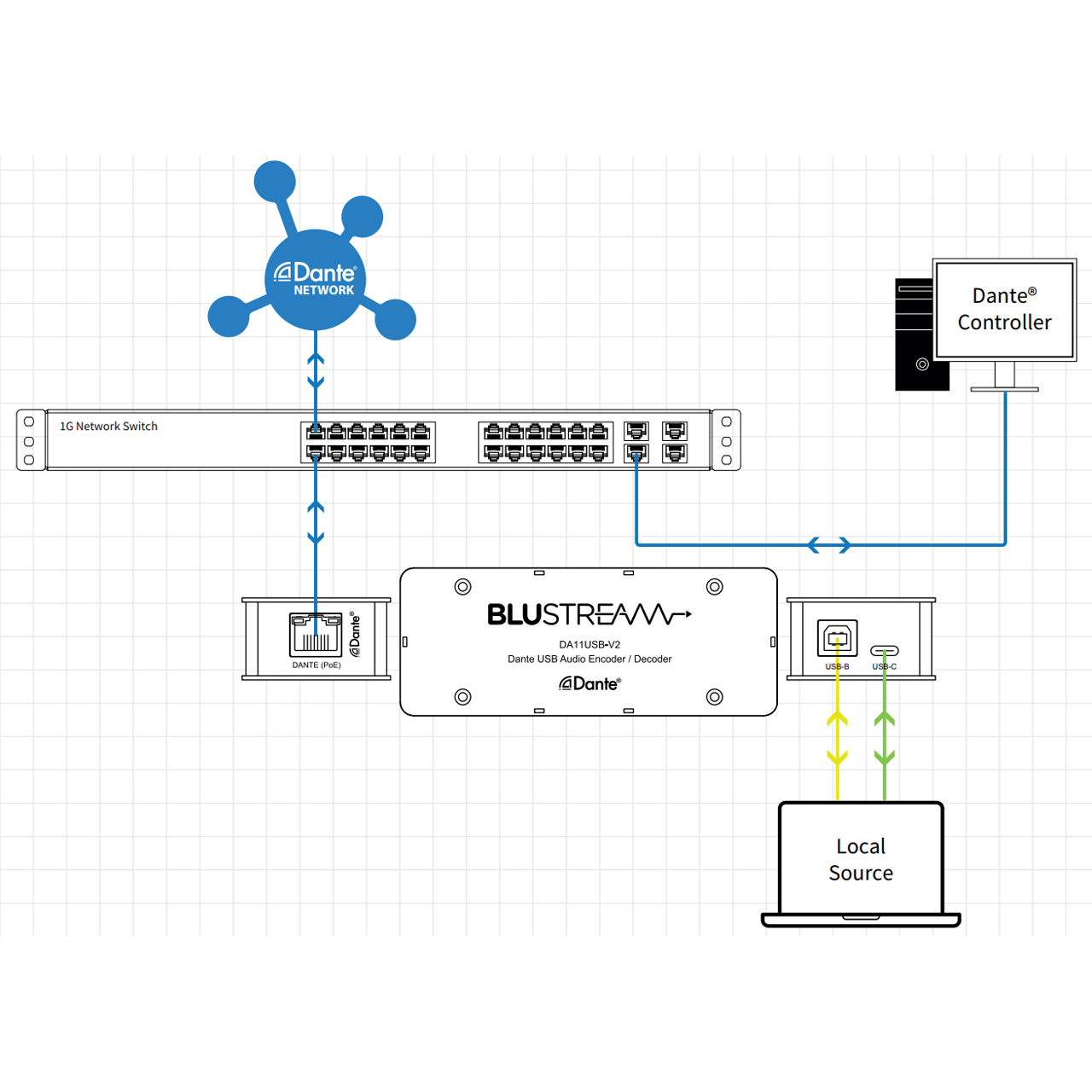The Blustream DA11USB-V2 has been designed to both encode 2ch USB audio to a Dante digital signal, and decode a Dante digital signal to 2ch USB audio.