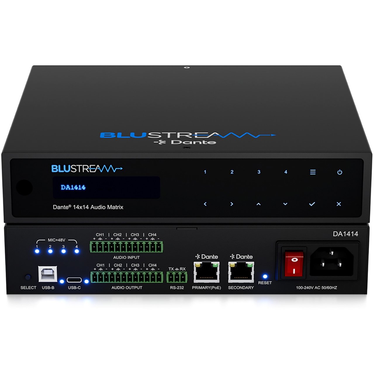 The Blustream DA1414 is an advanced PoE+ powered audio matrix designed for efficient and seamless distribution of various audio sources across a multi-zone setup. The unit offers advanced audio processing features such as independent routing of mono audio signals, volume control, balance adjustments, and up to an 8-band parametric equaliser, including high/low shelf, and high/low pass filtering on both the input and output stages.