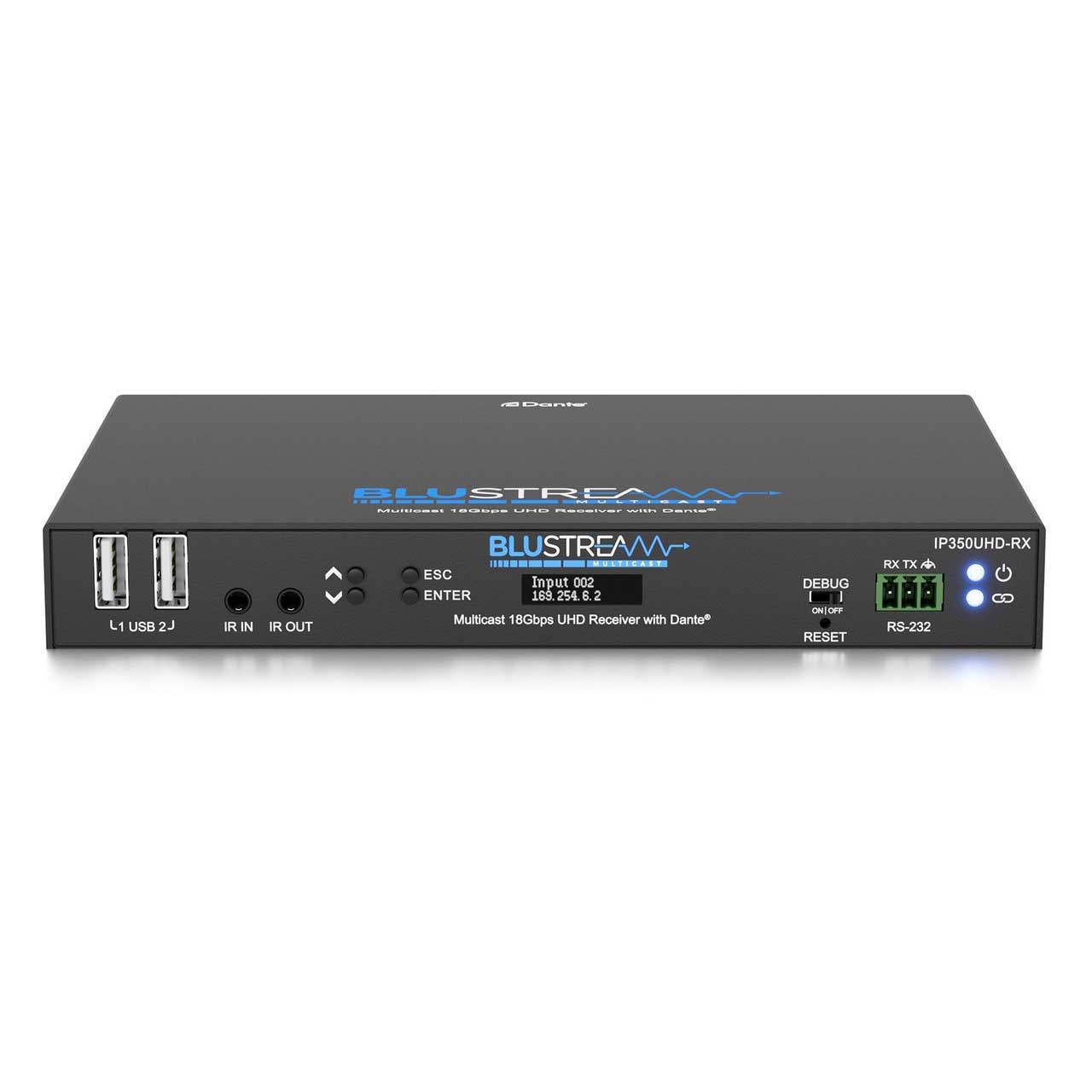 The IP350UHD-RX can support both video and Dante audio distribution from a single network. A second RJ45 connection allows for the Dante audio network interface to be segregated from the video over IP network if required.