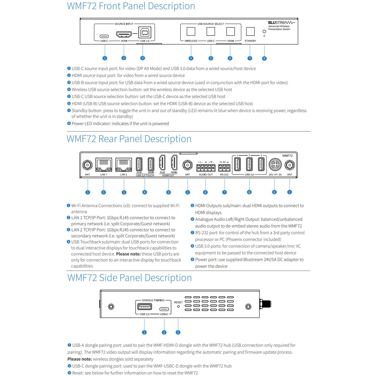 The WMF72 is also compatible with Blustream WMF-USBC-D and WMF-HDMI-D plug & play wireless dongles (sold separately, providing an ideal BYOD solution for your boardroom, classroom or huddle-space application.