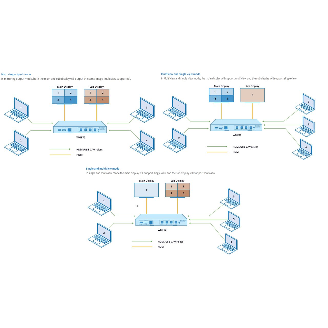 The WMF72 provides enhanced features including dual HDMI output for mirrored or managed source control with multiview presentation, video scaling and web-GUI for control and configuration, localised 2.4/5G WiFi hotspot, and dual LAN connection. The WMF72 also features OSD control, USB camera and MIC over WiFi, USB touch-back to connected host device, whiteboard and screen overlay annotation, manual or automated source selection, and control via front panel, RS-232 and TCP/IP.