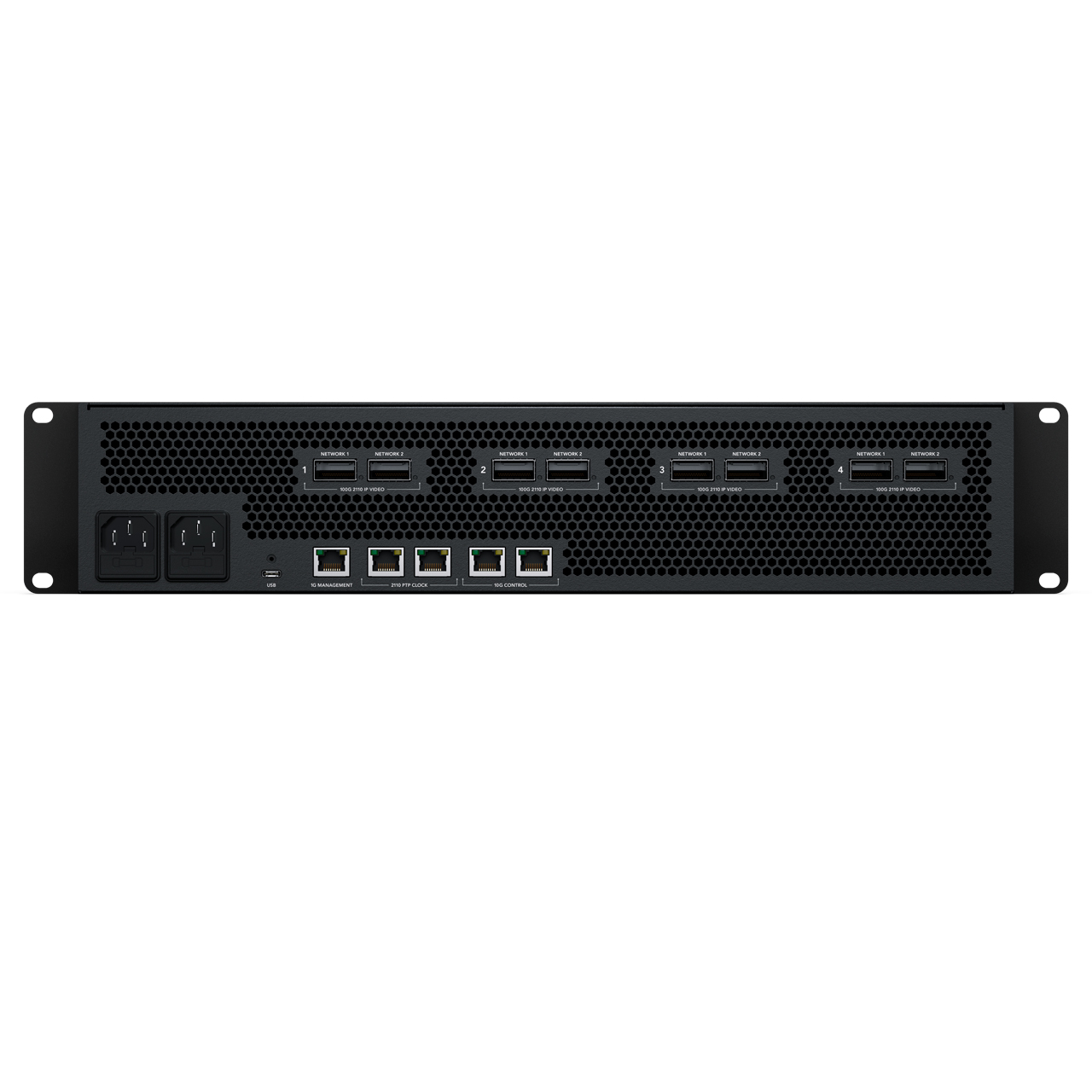 The standard Blackmagic Design ATEM 4 M/E Constellation IP has 32 standards converted SMPTE-2022-7 inputs using 4 sets of dual redundant 100G Ethernet connections. You also get 24 SMPTE-2110 outputs, 16 ATEM Advanced Keys, 4 multi-views and 2 SuperSource for a total of 12 DVEs.