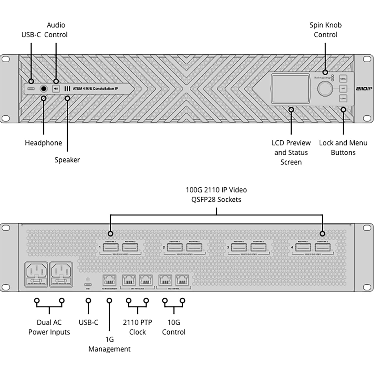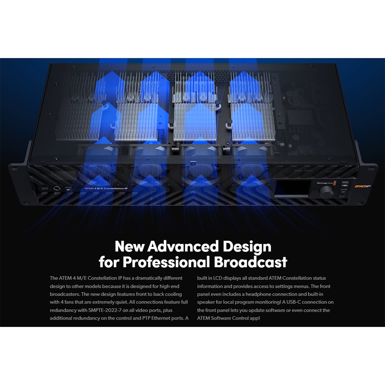 The Blackmagic Design ATEM Constellation IP is a family of live production switchers with familiar ATEM Constellation features and a more powerful design that's fully SMPTE-2110 native! This means you have the option of adding any mix of traditional 12G-SDI or modern SMPTE-2110 IP video. Plus all IP video connections are fully redundant and SMPTE-2022-7 compliant. ATEM Constellation IP is designed for the chaos of live production, as it will convert non-standard video sources and fix PTP clock problems because each input has a dedicated standards converter and re-synchronizer! You also get powerful ATEM Constellation features like DVEs, advanced chroma keyers, media players, multi-views and SuperSource!