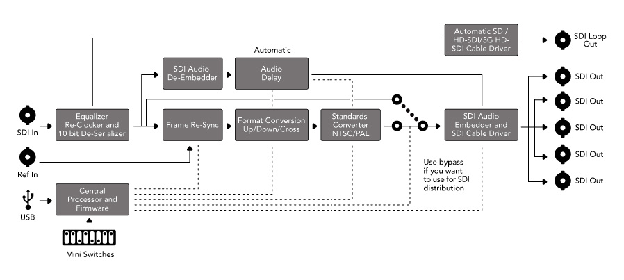 The mini converter includes auto SD/HD switching, which allows the converter to instantly switch between SD and HD video formats automatically when the video input changes. Compatible with the advanced 3 GB/s SDI technology, the converter includes a built-in USB connection for future updates and video format compatibility.(USB Cable not included).