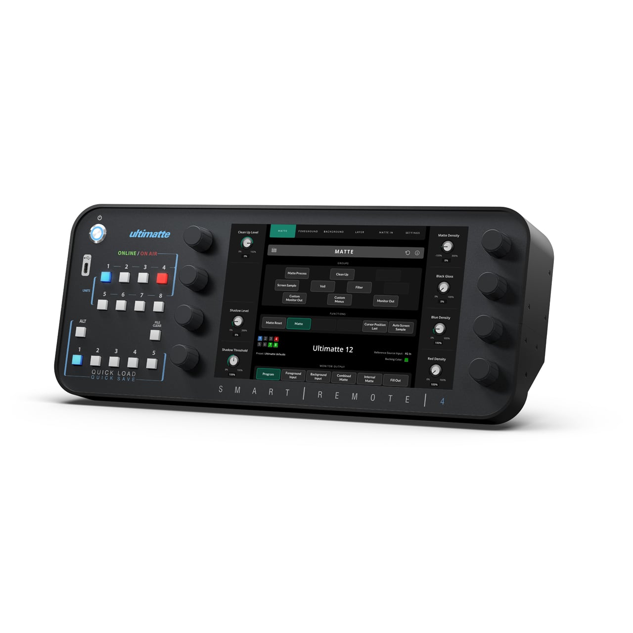 The Blackmagic Design Ultimatte Smart Remote 4 G2 is a 10.1" touchscreen remote that connects via Ethernet to control up to eight Ultimatte 12 units. Combined with the monitor cascade, this means you can view up to eight Ultimatte 12 units without adding a video router. Smart Remote 4 also features physical buttons and knobs for finer control of the Ultimatte 12 parameters. There are also buttons for quickly loading and saving presets, and a touchscreen that gives you full control over every Ultimatte parameter. Plus the front panel of the Ultimatte rack unit also has buttons to allow recall of custom presets! You can also create custom control solutions with the easy to use text based Ultimatte control protocol.