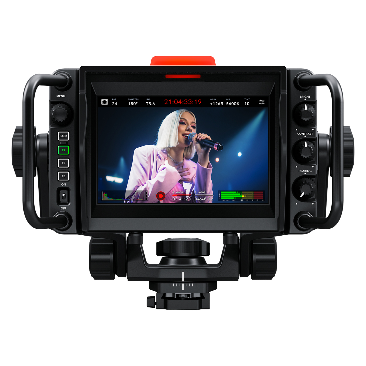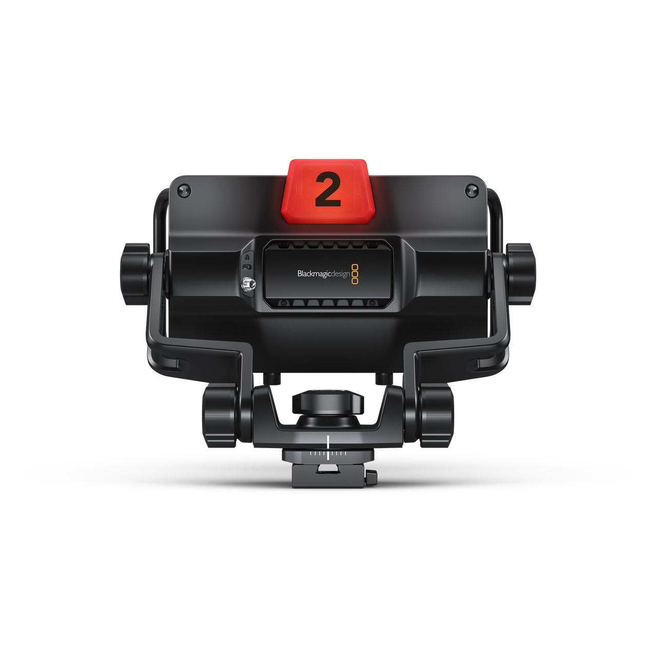 The back of the Blackmagic URSA Cine Studio Viewfinder features a large tally light that illuminates red for on-air, green for preview, and orange for ISO recording. As the director cuts between cameras on the ATEM switcher, tally information is sent back to the camera over SDI so the light is lit when the camera is on the air. You only need to set the correct camera number in the URSA Broadcast camera menus! The tally light is very large so it's easy to see when the presenter is a long distance from the camera. Plus, the Blackmagic URSA Cine Studio Viewfinder also includes clip-on number decals that insert into the tally light, so each camera is clearly numbered and easy for presenters to see.