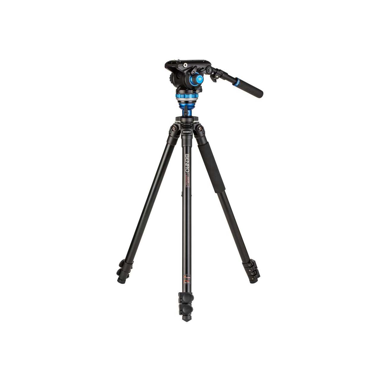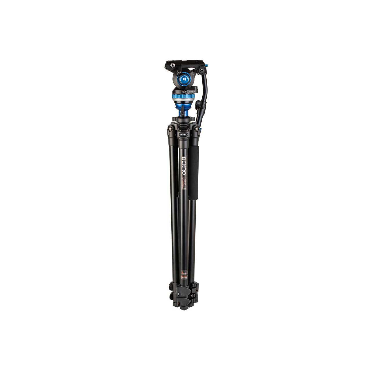 The Benro A2573FS6PRO is a single tube style video tripod with the S4 PRO video head. The center column includes a leveling adapter so that the head can be leveled independently without having to adjust the tripod legs. The tripod also features flip locks, center column weight hook and 3 independent leg position angles. Rubber and spiked feet are both included.