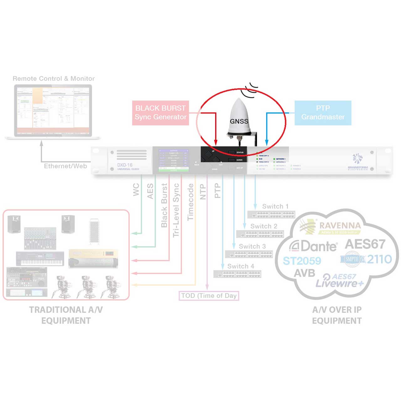 GPS not only provides an extremely accurate timing source, it also enables DXD's in remote locations to be locked and in phase with one another. Additionally, with the GPS option, the DXD will have a higher priority as a PTP Grandmaster.