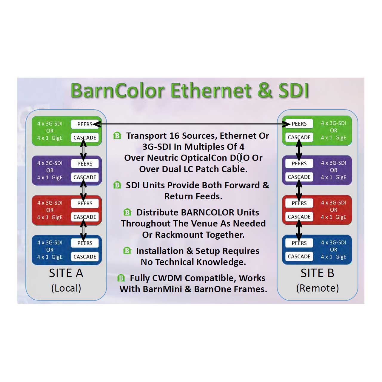 Designed to be a cost-effective and easy-to-deploy solution for transmitting multiple video signals both directions on a single fiber cable. BarnColor allows you to handle up to 32 x 3G-SDI signals (16 forward and 16 returns). Each BarnColor device handles up to 8 signals (4 forward and 4 returns) and up to 4 different colors of BarnColors can be daisy chained. This flexible system is easy to install, upgrade and use. It is well suited for both fixed and temporary installations.