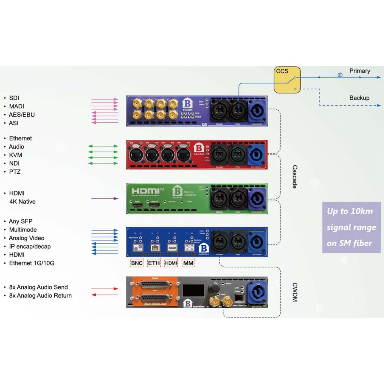 Barnfind's BarnColor-Native-4K capability is crucial for event companies using large LED monitors, where any compression artifacts can significantly impact viewer experience. Each BarnColor-Native-4K unit transports one HDMI signal, and by cascading four different colored BarnColor-Native-4K units, you can transmit four uncompressed HDMI™ signals over an OpticalCon DUO or LC fiber cable.