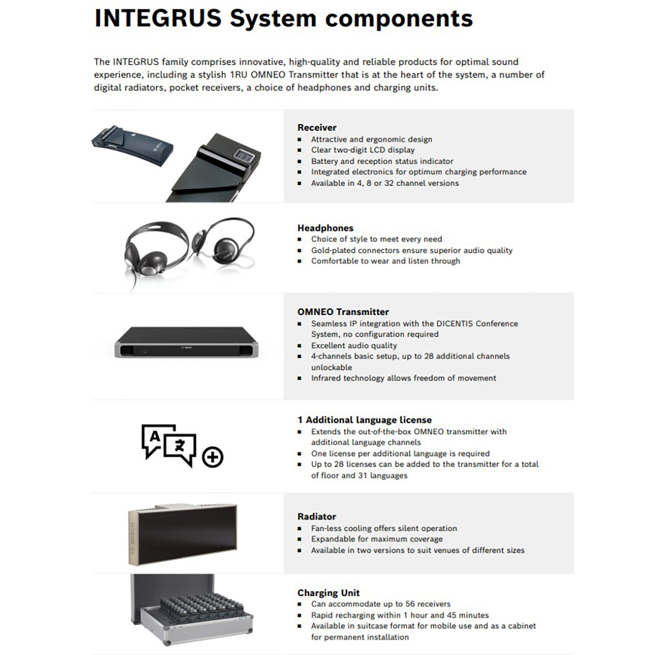 The INTEGRUS Wireless Language Distribution System has been specifically designed for multilingual meetings to enable attendees to understand speeches in their native language. The audio signals of simultaneous interpretations are transmitted to pocket receivers and headphones via radiators utilizing proven, tamper-free infrared technology. Participants can move freely around the location whilst still able to follow proceedings. The system is highly flexible and offers exceptional audio quality, making it ideal for parliaments, conference centers and international organizations, no matter what the size of the event or venue. As a result, it has become the wireless, infrared language distribution system of choice for event organizers.