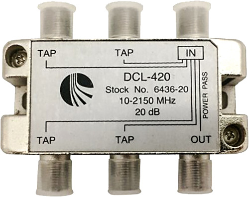 Blonder Tongue's DCL-4XX DCL-4 is a directional coupler with power passing capability on the through lin (in/out ports) with tap port(s) DC blocked. This Directional Tap has 4 Outputs, 10-2150 MHz, and Power Passing Thru.