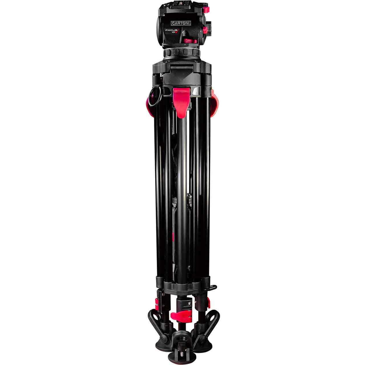 Cartoni KF10-RLM Focus 10 Fluid Head assembled with Red Lock Aluminum Tripod, Mid level Smart Lock spreader, rubber feet and soft bag.