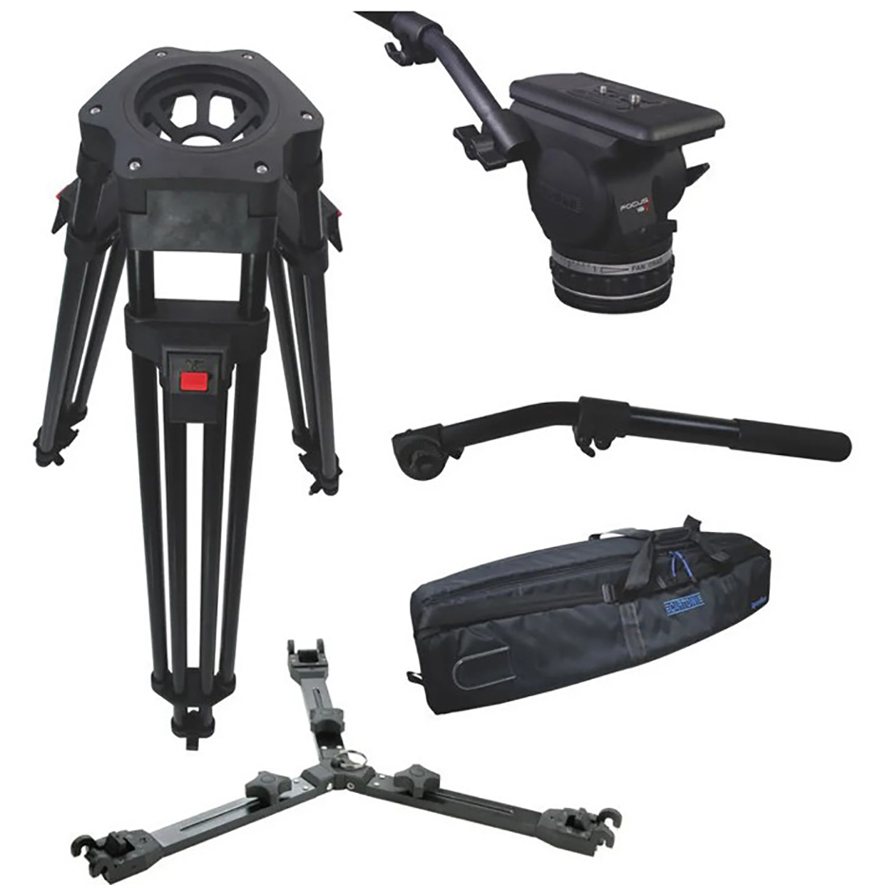 The Cartoni KF18-1HM is a Focus 18 Fluid Head with H601 Tripod Legs, a P731 Spreader, 2nd Pan Bar, Rubber Feet and Soft Case. It features a 100mm Bowl on a 2-Section Heavy-Duty Aluminum EFP Tripod.