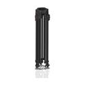 The height adjustment is performed by a fast clamp and includes a safety lock to prevent accidental falls. The bottom foot includes a threaded spike receiving the adjustable rubber foot and interfaces with dollies and ground spreaders. When this tripod is assembled with a mid-level spreader, it requires pivoting tripod feet.