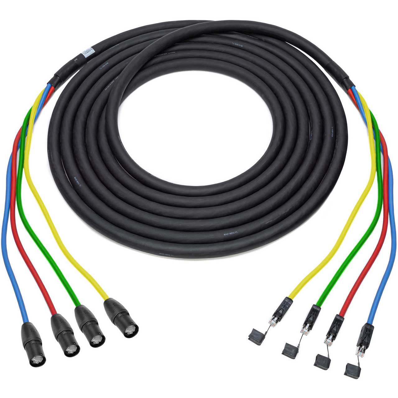 The tactical grade CAT6AXTRM4EP series by Laird offers a rugged field option for Data Transmission, Video Walls, DANTE and other Digital Audio Protocols. It will quickly become recognized as the strongest link in your data chain in studios, live events, staging and rental. These shielded Cat6a cables give you 4-Channels terminated with locking Neutrik etherCON RJ45 TOP cable carrier RJ45 housings on one end and ProShell RJ45 on the other. These cables will offer you years of repeated connections in mobile productions or harsh environments. The Laird CAT6AXTRM4EP is suitable for 10BASE-T, 100BASE-TX (Fast Ethernet), 1000BASE-T / 1000BASE-TX (Gigabit Ethernet) and 10GBASE-T (10-Gigabit Ethernet).