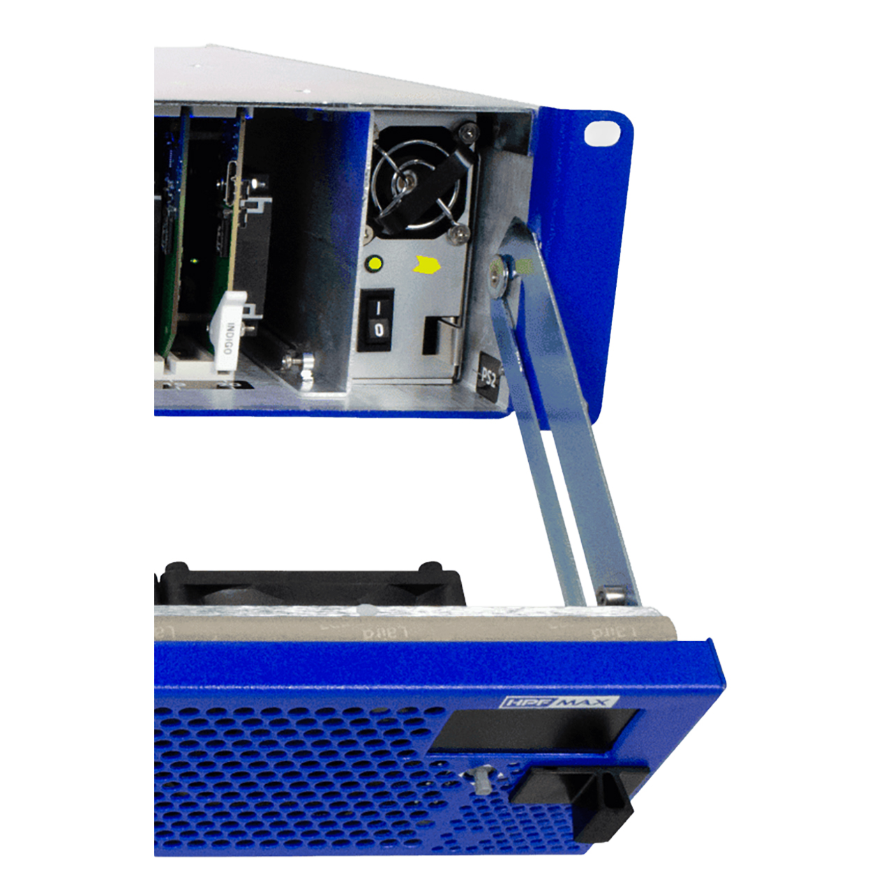The HPF-MAX can accommodate two front-loaded PS-MAX power supply modules. Adding a second (optional) supply gives the frame full power redundancy. The PS-MAX power supply unit is interchangeable as a primary or redundant power supply module, with supplies in either position being hot-swappable. Each power supply has an independent cooling fan and a front-mounted power switch.