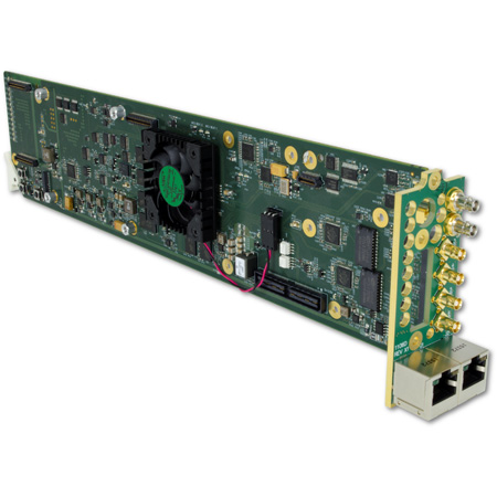 This module mates with the Cobalt 9904-UDX-4K 12G/6G/3G/HD/SD UHD Up/Down/Cross Converter/Frame Sync/Embed/De-Embed Audio Processor card and is Cobalt's next generation of advanced scaler/frame synchronizers for the openGear platform. The 9904-UDX-4K upconverts 12G/6G/3G/HD/SD to either UHD1 3840x2160 Square DIvision Multiplex (SDM) or Two-Sample Interleave (2SI) quad 3G-SDI based formats, or can output ST 2082 12G-SDI for single-wire 4K transport. With both 12G-SDI and quad 3G-SDI inputs, the 9904-UDX-4K can downconvert 12G and quad UHD. The 9904-UDX-4K provides an HDMI 2.0 output for economical 4K video monitoring. The 9904-UDX-4K offers numerous options, including SDR-to-HDR conversion and color correction.