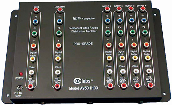 The AV501HDX is a 1x5 HDTV Component or Composite Video with Digital Audio or Left and Right Audio Distribution Amplifer.