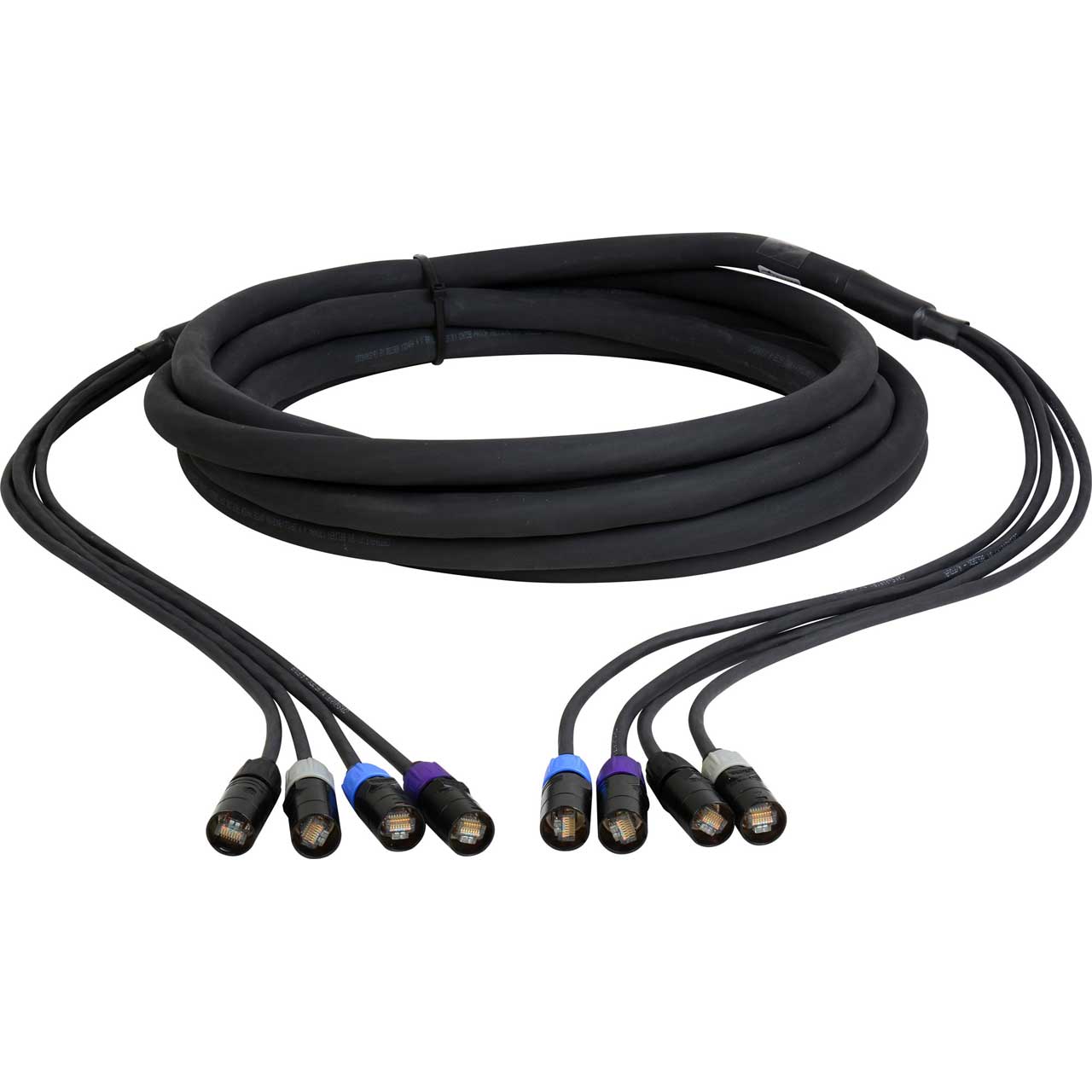To compliment applications with balun systems, our shop has crafted a series of CAT5E Tactical Ethernet Snakes. These can be used with balun products or as Datacom products. Perfect for all professional audio applications. Designed with heavy duty, tour-grade flexible jacket. This series features the RJ45 connection protected in the Neutrik Ethercon NE8MC-B Black shell. EtherCon series is especially developed for, but not limited to, audio and stage applications including DMX systems. Nevertheless the operational area of EtherCon is not limited to the entertainment industry. The EtherCon male cable connector carrier comes along in a robust diecast shell and the unique Neutrik chuck-type strain relief for optimal cable and plug protection.