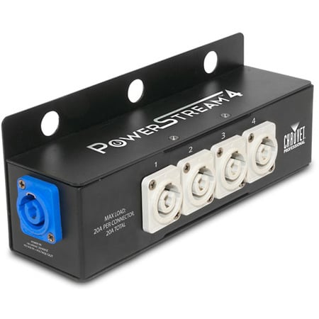 Chauver PowerStream 4 is an ingenious splitter for powerCON connections. Placed into the main power feed, it taps into up to five connections out to fixtures, allowing users to pre-rig a truss and limit the need for additional cables.